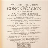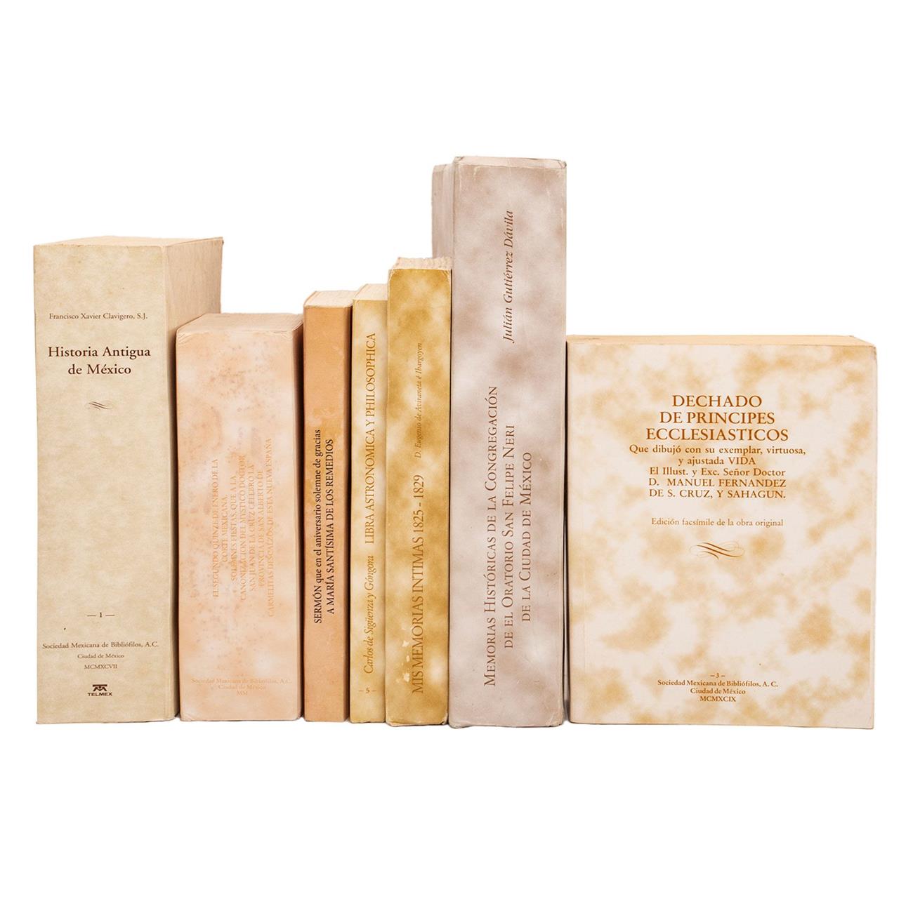 COLECCIÓN DE LA SOCIEDAD MEXICANA DE BIBLIÓFILOS. MÉXICO: 1990 – 2009. EJEMPLARES NUMERADOS Y FUERA DE COMERCIO. a) Gutiérrez Dávila, Julián. Memorias Históricas de la Congregación del Oratorio San Felipe Neri de la Ciudad de México. fo. marquilla. Edición facsimilar. Encuadernado en rústica. b) Fernández de S. Cruz y Sahagún, Manuel. Dechado de Príncipes Ecclesiasticos. 8o. marquilla. Edición facsimilar de la obra original. Encuadernado en rústica. c) Ximenez de Bonilla, Joachin. El Segundo Quinze de Enero de la Corte Mexicana. Solemnes Fiestas, que a la Canonización del Mystico Doctor San Juan de la Cruz Celebró la Provincia de San Alberto de Carmelitas Descalzos de esta Nueva España. 8o. marquilla. Edición facsimilar de la obra original de 1730. Encuadernado en rústica. d) Sigüenza y Góngora, Carlos de. Libra Astronómica y Philosophica. 8o. marquilla. Edición facsimilar. Encuadernado en rústica. e) Aviraneta e Ibargoyen, Eugenio de. Mis Memorias Íntimas 1825 – 1829. 8o. marquilla. Edición facsimilar. Encuadernado en rústica. f) Bautista Díaz Calvillo, Juan. Sermón que en el Aniversario Solemne de Gracias a María Santísima de los Remedios. 8o. marquilla. Celebrad en esta Santa Iglesia Catedral el Día 30 de Octubre de 1811 por la Victoria del Monte de las Cruces, Encuadernado en rústica. g) Clavigero, Francisco Xavier. Historia Antigua de México. 4o. marquilla. Edición facsímile del manuscrito original. Encuadernado en rústica. Total de piezas: 7. Estimado $3,500-8,000
