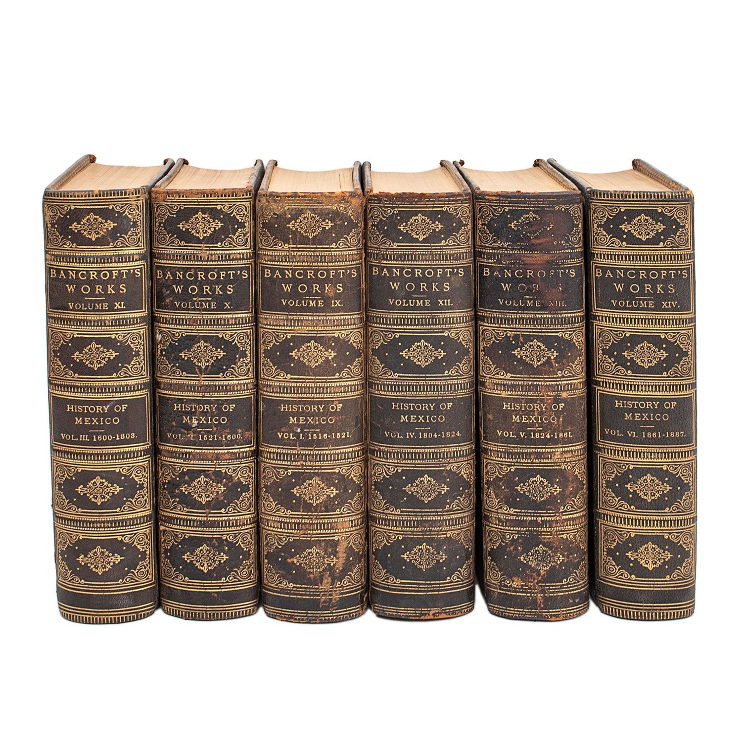 4o. marquilla, CXII + 702; XIV + 790; XV + 780; XIV + 829; XIII + 812; XII + 760 p. Works: Volumes. IX – XIV. History of Mexico: Volumes: I – VI. Volume I 1516 – 1521. Volume II 1521 – 1600. Volume III 1600 – 1803. Volume IV 1804 – 1824. Volume V 1824 – 1961. Volume VI 1861 – 1887. Encuadernados en pasta dura, en piel. Piezas: 6.