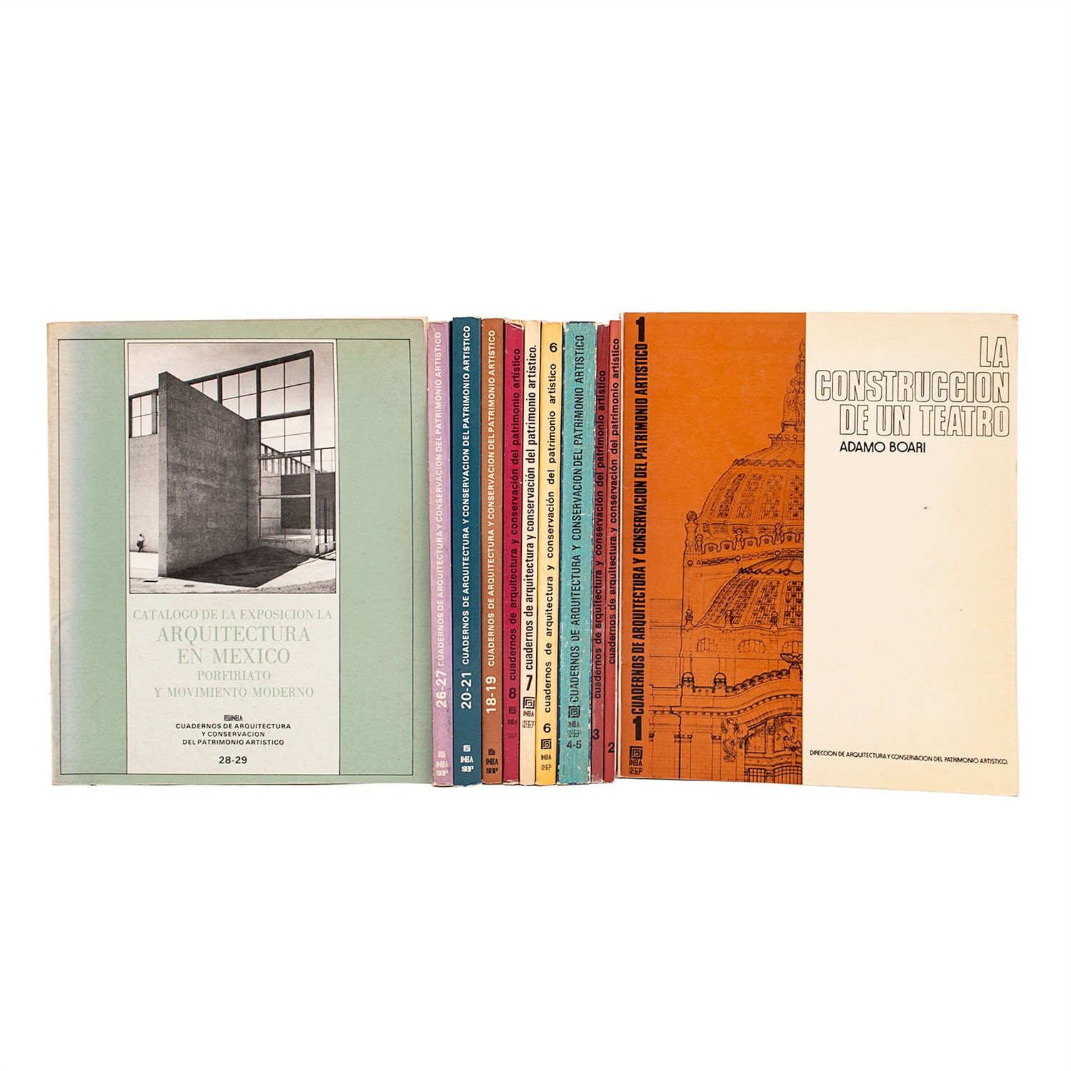 4o. marquilla. Números: 1 – Adamo Boari "La Construcción de un Teatro"; 2 – "Restauración de Monumentos"; 3 – "1968/78 Una Década de Arquitectura Mexicana"; 4-5 – "Symposium Interamericano de Conservación del Patrimonio Artístico": 6 – Graciela de Garay A. "La Obra de Carlos Obregón Santacilia, Arquitecto"; 7 – Antonio Bonet Correa "La Arquitectura de la Época Porfiriana"; 8 – Carlos Flores Marini "Apuntes Sobre Arquitectura"; 18-19 – Elisa García Barragán "Manuel F. Álvarez, Algunos Escritos"; 20-21 – "Apuntes para la Historia y Crítica de la Arquitectura Mexicana del Siglo XX: 1900 – 1980"; 26-27 "La Práctica de la Arquitectura y su Enseñanza en México"; 28-29 "Catálogo de la Exposición la Arquitectura en México, Porfiriato y Movimiento Moderno". Encuadernados en rústica. Piezas: 11.
