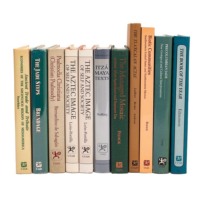 COLECCIÓN DE LIBROS PUBLICADOS POR "UNIVERSITY OF UTAH PRESS". PIEZAS: 11. Autores y títulos: Charles Andrew Hofling "Itzá Maya Texts"; Miguel León Portilla "The Aztec Image of Self and Society" (2); Munro S. Edmonson "The Book of the Year": Bernardino de Sahagún "Psalmodia Christiana"; Scott L. Fedick "The Managed Mosaic"; Barbara Voorhies "Ancient Trade and Tribute"; Burr Cartwright Brundage "The Jade Steps"; Frederick W. Lange "Precolumbian Jade"; David E. Brown "Biotic Communities Southwestern United States and Northwestern Mexico"; James Lockhart "The Tlaxcala Actas". Varios formatos. Encuadernados en pasta dura y uno en rústica. Piezas: 11. Estimado $2,000-3,000