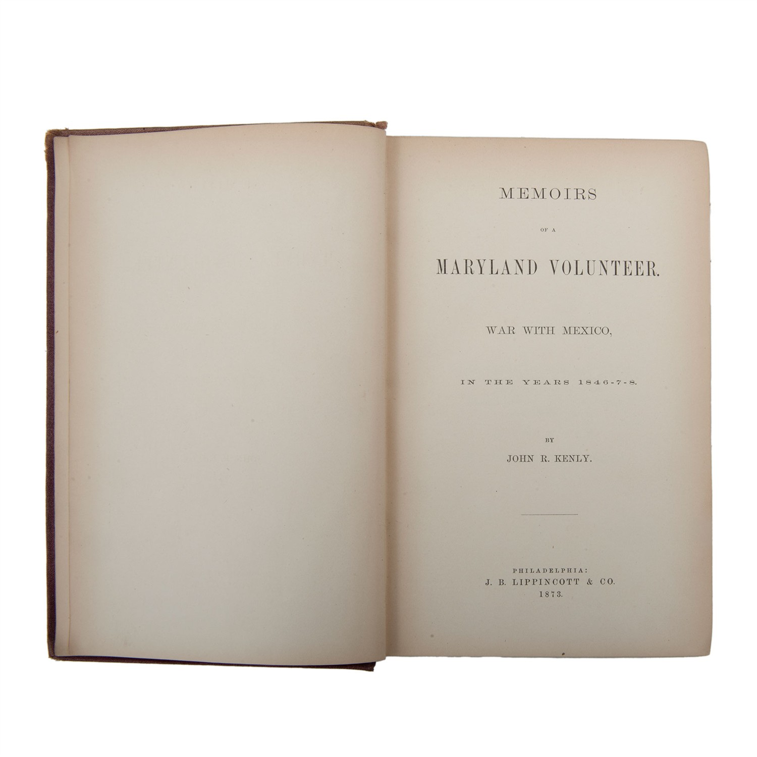 KENLY, JOHN R. MEMOIRS OF A MARYLAND VOLUNTEER, WAR WITH MEXICO IN THE YEARS 1846-7-8. PHILADELPHIA: J. B. LIPPINCOTT & CO., 1873. 8o. marquilla, 521 p. Primera edición. Lomo con pequeña rasgadura, tercio superior. Encuadernado en pasta dura, en tela. En esta primera edición narra diversas anécdotas en México y su participación en batallas, hasta los combates de Veracruz. Obra dedicada al general Zachary Taylor. Estimado $1,300-3,000