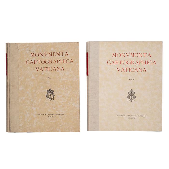 ALMAGIA, ROBERTO. MONUMENTA CARTOGRAPHICA VATICANA. CITTÀ DEL VATICANO: BIBLIOTECA APOSTOLICA VATICANA, 1944. fo. marquilla. Tomos I - II. Ilustrados. Encuadernados en pasta dura. Piezas: 2.