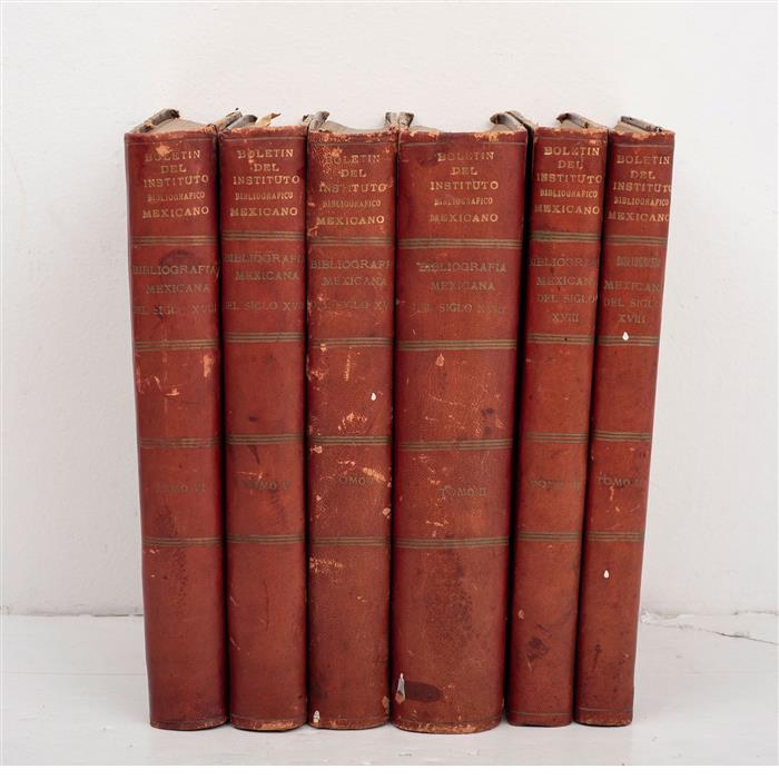 LEÓN, NICOLÁS. BIBLIOGRAFÍA MEXICANA DEL SIGLO XVIII. MÉXICO: IMPRENTA DE FRANCISCO DÍAZ DE LEÓN - IMPRENTA DE LA VIUDA DE FRANCISCO DÍAZ DE LEÓN, 1902 Y 1908. 4o. marquilla. Tomos I - VI. Números 1, 4, 5, 7, 8, y 10. Boletín del Instituto Bibliográfico Mexicano. Conservan pastas originales en rústica. Pastas gastadas. Tomo II: pasta anterior con faltante. Encuadernados en pasta dura, lomo en piel. Piezas: 6. Palau: 135486. Primeramente se publicó este importante trabajo en los números 1, 4, 5, 7, 8, y 10 del Boletín del Instituto Bibliográfico Mexicano. COMPLETO, RARO EN COMERCIO. Estimado $7,000-9,000