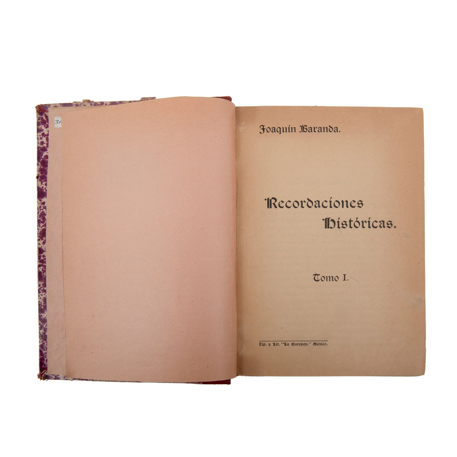 BARANDA, JOAQUÍN. RECORDACIONES HISTÓRICAS. MÉXICO: TIP. Y LIT. LA EUROPEA - TIP. ECONÓMICA, CA. 1907. 4o., XX + 614 p. + 1 h. Tomo I. Ex Libris de Joaquín Cortina Goribar. Encuadernado en pasta dura, lomo en piel. Estimado $1,800-4,000