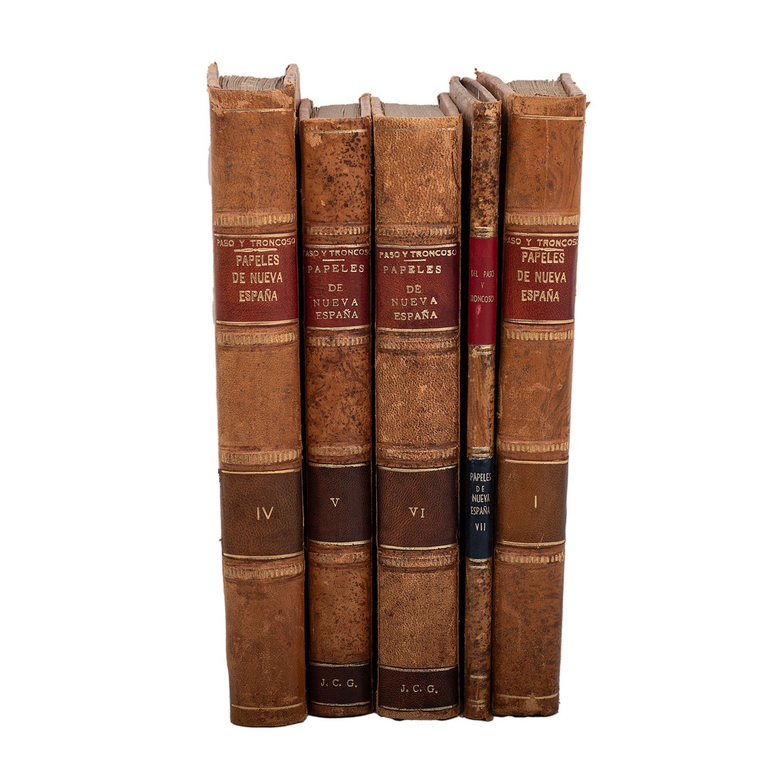 PASO Y TRONCOSO, FRANCISCO DEL. PAPELES DE NUEVA ESPAÑA. SEGUNDA SERIE - GEOGRAFÍA Y ESTADÍSTICA. MADRID: SUCESORES DE RIVADENEYRA, 1905 - 1906. / MÉXICO: TALLERES GRÁFICOS DEL MUSEO NACIONAL DE ARQUEOLOGÍA, HISTORIA Y ETNOGRAFÍA, 1932. 4o. marquilla. Tomos: I y IV. Tomos Facsimilares, México, 1932: V, VI y VII. Tomo I: Suma de visitas de pueblos por orden alfabético. Manuscrito 2.800 de la Biblioteca Nacional de Madrid, anónimo de la mitad del Siglo XVI. Sin refinar. Tomo IV: Relaciones Geográficas de la diócesis de Oaxaca. Manuscritos de la Real Academia de la Historia de Madrid y del Archivo de Indias de Sevilla. Años 1579 - 1581. Sin refinar. Tomo V: Relaciones Geográficas de la diócesis de Tlaxcala. Tomo VI: Relaciones geográficas de la diócesis de México. Manuscritos de la Real Academia de la Historia de Madrid y del Archivo de Indias de Sevilla. Años 1579 - 1582. Tomo VII: Relaciones geográficas de las diócesis de México y de la de Michoacán. Manuscritos de la Real Academia de la Historia de Madrid y del Archivo de Indias de Sevilla. Años 1579 - 1582. Total de piezas: 5. Palau: 214270. Menciona que el Tomo II no se publicó. Estimado $1,800-5,000