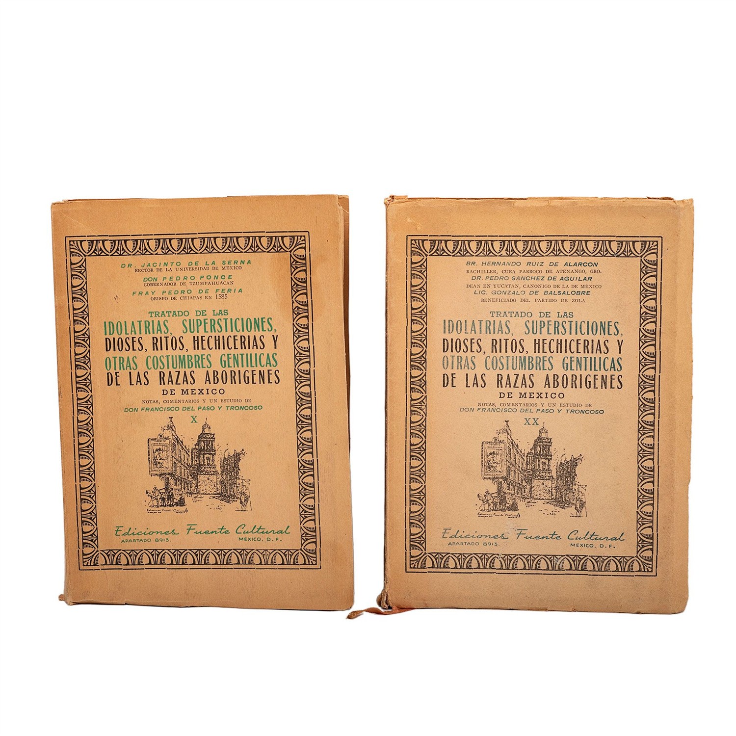SERNA, JACINTO DE LA - PONCE, PEDRO - FERIA, PEDRO DE LA / RUIZ DE ALARCÓN, HERNANDO - SÁNCHEZ DE AGUILAR, PEDRO - BALSALOBRE, GONZALO DE. TRATADO DE LAS IDOLATRÍAS, SUPERSTICIONES, DIOSES, RITOS, HECHICERÍAS Y OTRAS COSTUMBRES GENTILICAS DE LAS RAZAS ABORÍGENES DE MÉXICO. MÉXICO: EDICIONES FUENTE CULTURAL, 1953. 8o. marquilla, 463; 477 p. Segunda edición, ampliada con importantes suplementos e índices. Tomada de la primera: Museo Nacional, 1892. Notas, comentarios y un estudio de Don Francisco del Paso y Troncoso. Edición de 400 ejemplares. Encuadernados en rústica. Piezas: 2. Estimado $1,000-3,000