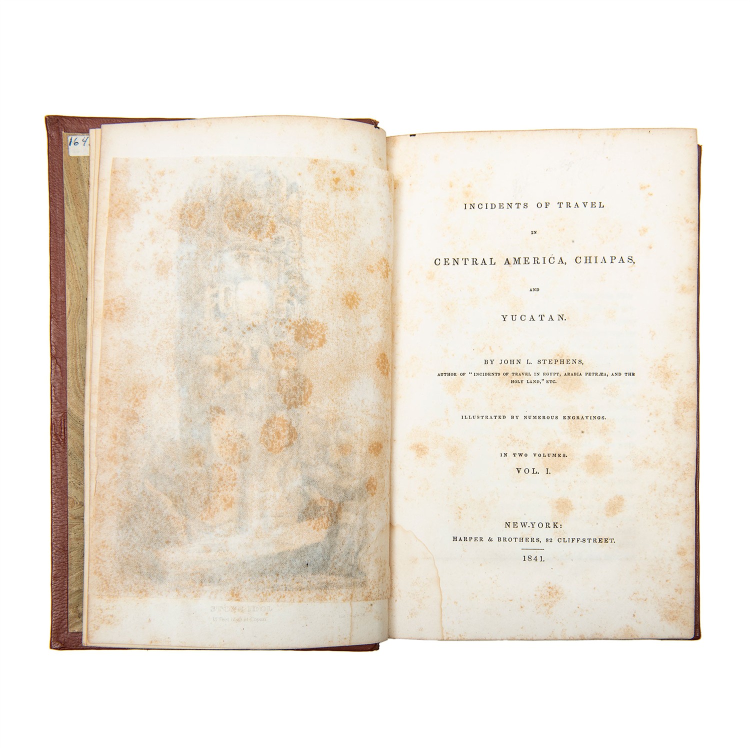 STEPHENS, JOHN L. INCIDENTS OF TRAVEL IN CENTRAL AMERICA, CHIAPAS AND YUCATÁN. NEW YORK: HARPER & BROTHERS, 1841. 4o., 424; 474 p. Illustrated numerous engravings. Ex Libris de Joaquín Cortina Goribar. Encuadernados en pasta dura, en piel. Piezas: 2. Las obras de Stephens y Catherwood son de gran importancia para el estudio de la cultura maya, no solo recopila datos importantes, sino también imágenes que ilustran detallada y fielmente los vestigios de las grandes aportaciones de esta antigua civilización. La mayor parte de las láminas e ilustraciones están basadas en los dibujos del artista inglés Frederick Catherwood, gran parte de los dibujos y bocetos originales de Catherwood se perdieron en 1842 a causa de un incendio, mientras se encontraban expuestas en un edificio de la calle Prince en Nueva York. Estimado $5,000-9,000
