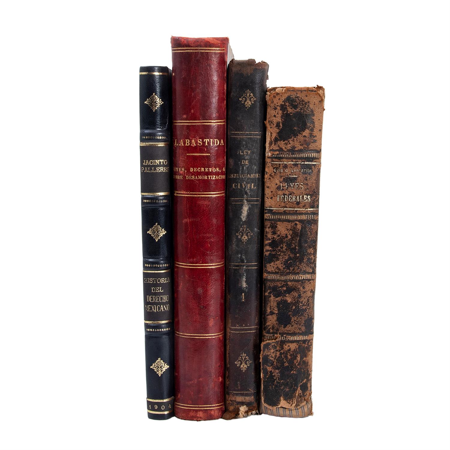 Subasta 1297T, Lote # 5 Colección de legislación Mexicana, Porfiriato. a) Labastida, Luis G. Colección de leyes, decretos, reglamentos, circulares, órdenes y acuerdos relativos a la desamortización de los bienes de corporaciones civiles y religiosas. México, 1893. b) Manresa y Navarro, José María. Ley de enjuiciamiento Civil comentada y explicada. México, 1874. c) Labastida, Luis G. Estudio de las leyes federales sobre administración fiscal. México, 1899. d) Pallares, Jacinto. Historia del derecho Mexicano. México, 1904. Total de Piezas: 4. Estimado $1,800-8,000