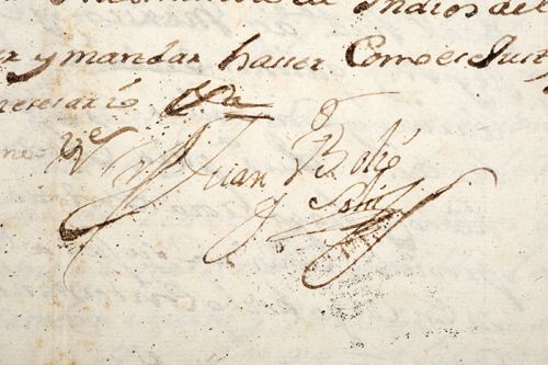 "... que aviendo llegado amí noticia estar puestos edictos, o que se ban aponer, a la Encomienda de Yndios del Pueblo de Uci, dela Juricdicion de esta Provincia que vacó por fin y muerte del Capn. D. Gaspar de Salazar su ultimo poseedor y sabiendo que por dichos edictos deben ser llamados los benemeritos que le puedan obtener... que las que en mi Concurren son tan Urgentes, como el hallarme notoriamente pobre, como es publico, y loes asimismo ser Yo cassado con Da. Josepha Chacon de Salazar, nieta lexitima de... Dn. Gaspar de salazar...".Firma.