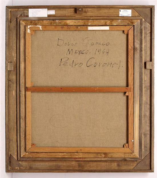 Subasta 612, Lote # 58 PEDRO CORONEL Dolor opaco Firmado y fechado México 1964 al reverso. Óleo sobre tela. Agradecemos a Martín Coronel Ordiales por la verificación de autenticidad de esta obra, septiembre de 2011. Procedencia: Galerías A. Cristobal. Colección particular ciudad de México. "Pasión intensa, intensa expresión: esto es el arte de Pedro Coronel. Su tema es el hombre. El hombre frente al destino, ese demonio de los mil rostros, uno para cada uno. Vida, muerte, sexo. El hombre indefenso resistiendo a los ocultos poderes, de cuya arbitrariedad depende. Diálogo interior. La pesadilla del hombre consiente de su condición humana." Paul Westheim. 95 x 80 cm Estimado $1,000,000-1,500,000