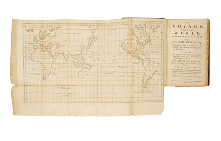 Subasta 714, Lote # 159 G - Anson, George. A Voyage Round the World, in the Years MDCCXL, I, II, III, IV. London: Printed for John and Paul Knapton, 1748. 8o. marquilla, 11 h. + 548 p. Compiled from his Papers and Materials of the Right Honourable George Lord Anson, and published under his Direction. By Richard Walter, M. A. Chaplain of His Majesty's Ship the Centurion, in that Expedition. The Fourth Edition. With Charts of the Southern Part of South America, of Part of the Pacific Ocean, and of the Track of the Centurion round the World. Con tres mapas plegados, uno con rasgaduras en dobleces. Cajos quebrados, sin cofia, sin pie, lomo y pastas gastadas. Encuadernado en pasta dura, en piel. En el mismo año de 1748 se realizaron las primeras cuatro ediciones. Estimado $9,000-12,000