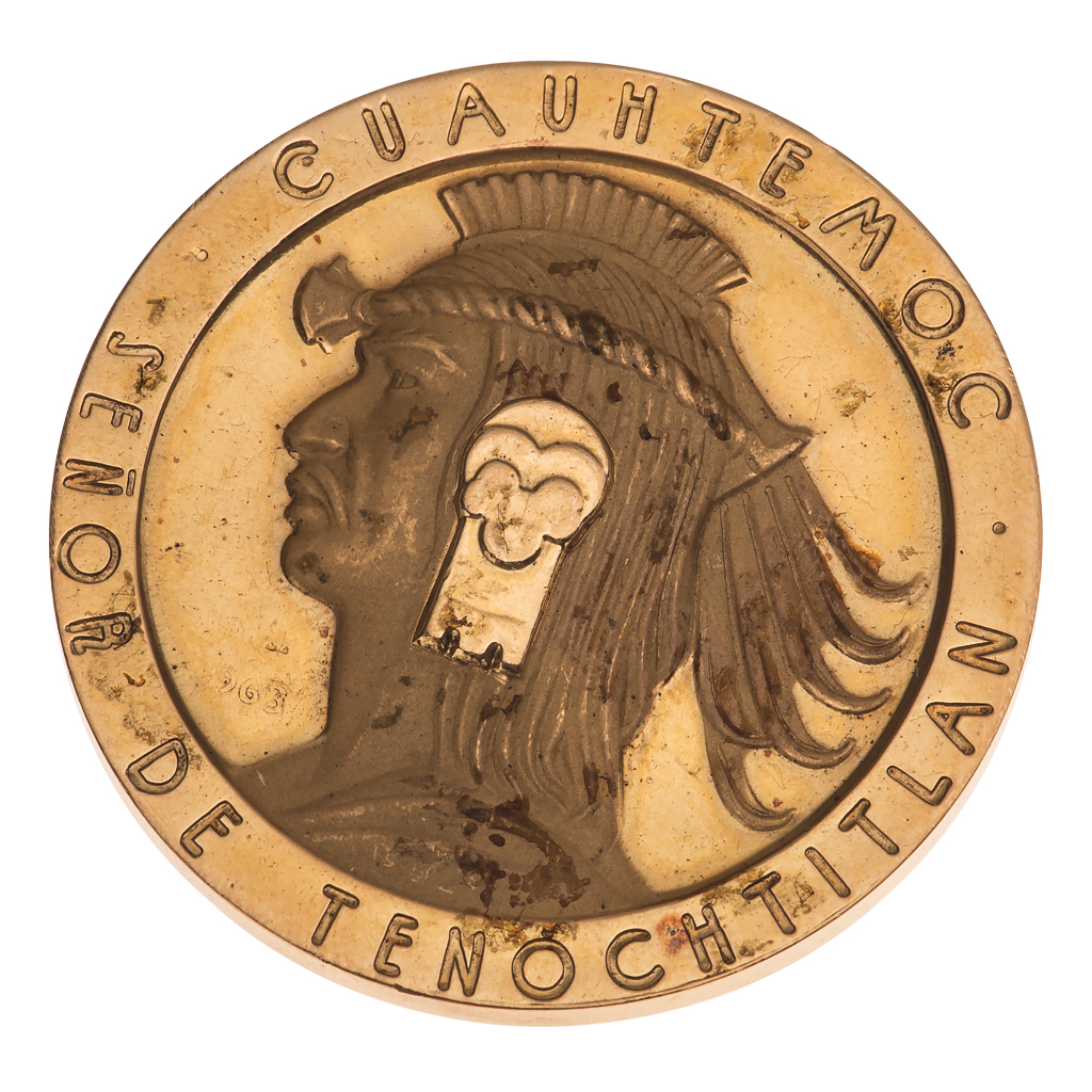 Anverso: Busto de Cuauhtémoc con grabado "CUAUHTEMOC SEÑOR DE TENOCHTITLAN". Reverso: Busto de Hernán Cortes con grabado "HERNAN CORTES CAPITAN GENERAL". Terminado satinado y brillante. Peso: 42.3 g. Diámetro: 4.1 cm