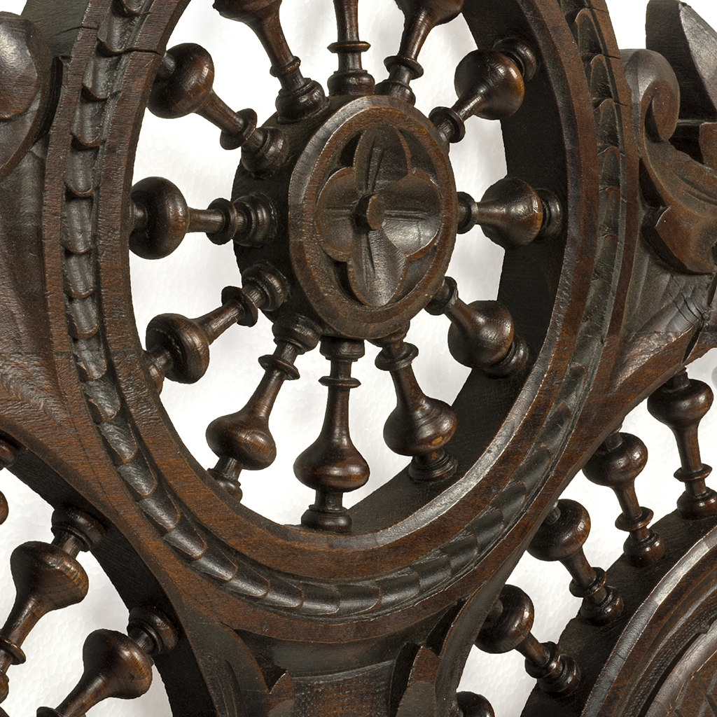 Dos percheros. Francia. Siglo XX. Elaborados en madera tallada de roble. Diseños para empotrar. Diferentes tamaños. Con ganchos de herrería. Decorados con barandillas y acantos. Presentan detalles de conservación, de estructura, fisuras, marcas y desgaste. Dimensiones: 52 x 122 cm. y 48 x 103 cm.. Estimado $ 3,000-5,000