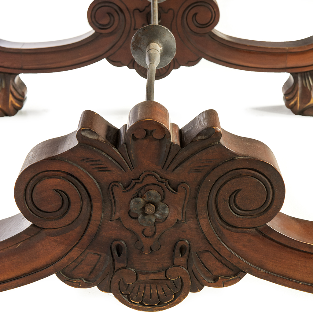 Mesa. Francia. Siglo XX. Elaborada en madera tallada de caoba. Con cubierta rectangular, soportes compuestos con terminación a manera de garra, travesaño de herrería y sistema de extensiones. Decorada con volutas, roleos, y cenefas vegetales. Presenta detalles de conservación, fisuras, ligeros faltantes, marcas y desgaste. Dimensiones: 78 x 171 x 100 cm. Estimado $ 8,000-10,000