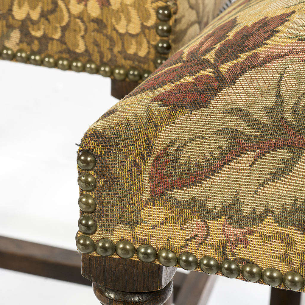 Juego de sillas. Francia. Siglo XX. Estilo Rústico. Elaboradas en madera tallada de roble. Con respaldos y asientos en tapicería floral color beige, chambrana en "H" y soportes compuestos. Presentan detalles de conservación, fisuras, marcas y desgaste. Piezas: 6 Estimado $ 6,000-8,000