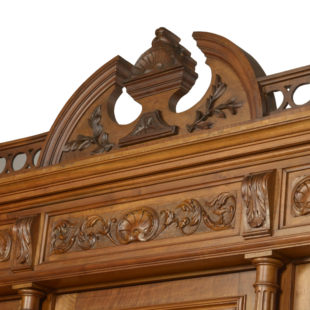 Con 2 puertas inferiores, 2 cajones centrales, 3 puertas superiores, de las cuales 2 tienen vidrio biselado, y soportes tipo bollo.