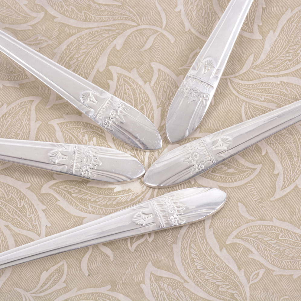 Juego de cubiertos. México. Siglo XX. Marca Cumex. Elaborados en alpaca plateada y hojas de acero inoxidable. Consta de: 6 cucharas para sopa, 5 cucharas para café, 6 tenedores para carne y 6 cuchillos para carne. Con caja (desgastada). Presentan ligeros detalles de conservación. Piezas: 23 Estimado $ 1,200-2,000