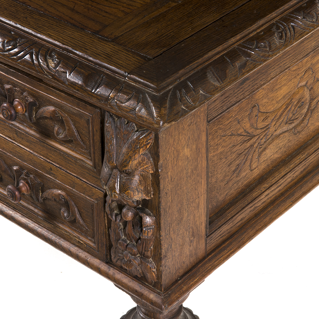 Escritorio. Francia. Siglo XX. Elaborado en madera tallada de roble. A 2 cuerpos. Con 5 cajones inferiores, 3 cajones superiores y soportes compuestos. Decorado con cenefas vegetales, acantos y roleos . Presenta detalles de conservación, de estructura, fisuras, faltantes, marcas y desgaste. Dimensiones: 112 x 129 x 69.5 cm. Estimado $ 7,000-9,000