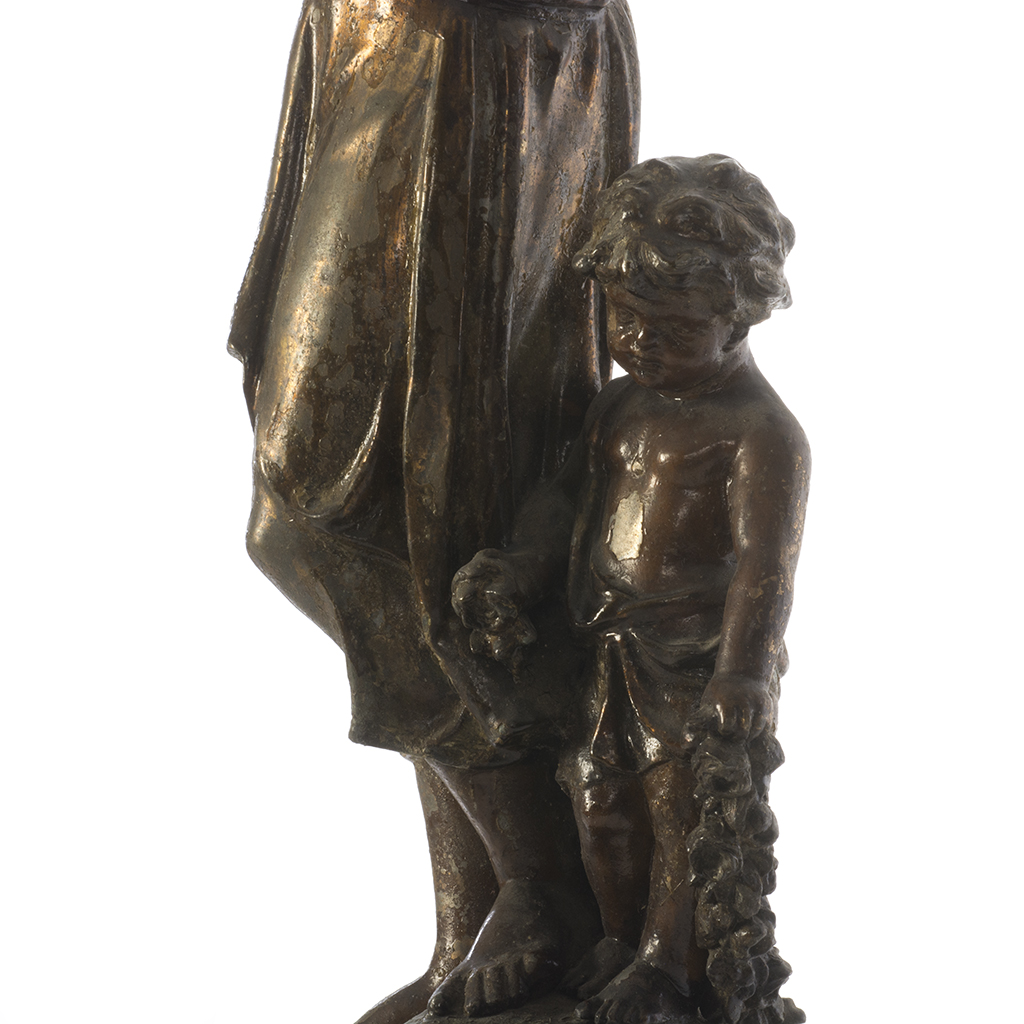 Lámpara de piso. Siglo XX. Elaborada en antimonio patinado. Para 1 luz. Con fuste a manera de ninfa con niño y base cuadrangular con motivos orgánicos. Presenta detalles de conservación, desprendimientos, marcas y desgaste. Dimensiones: 111 cm. Estimado $ 5,000-8,000