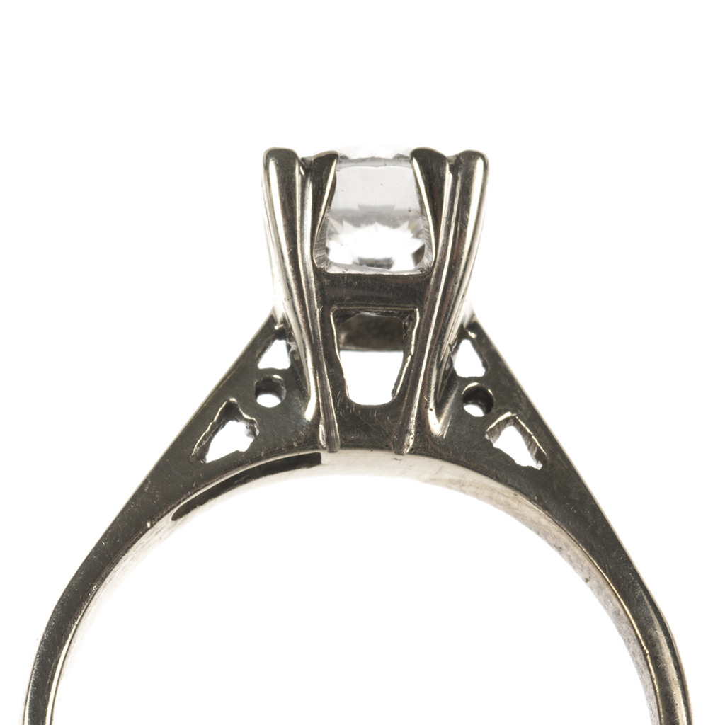 Subasta 896T, Lote # 295 Anillo solitario. Elaborado en plata paladio. Con cuarzo corte redondo facetado, ~ 0.60 ct. Medida aproximada: 6 1/2 Peso: 3.0 g. Estimado $ 1,300-1,500