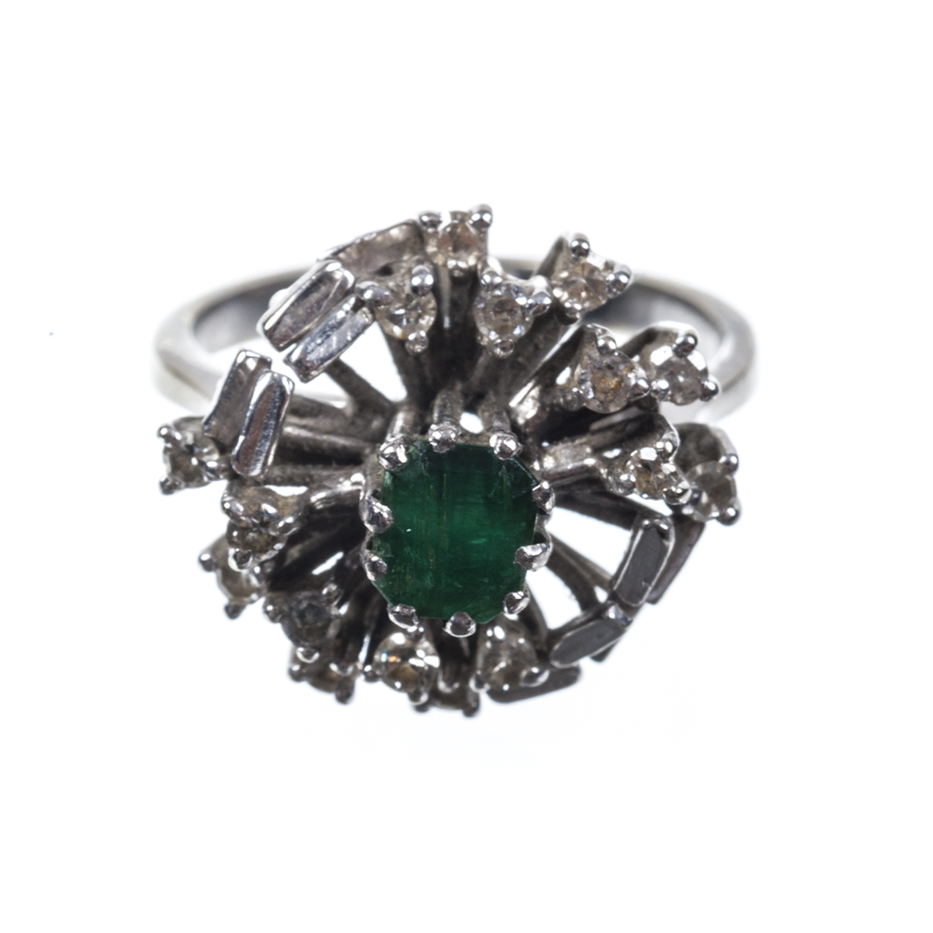 Anillo. Elaborado en oro blanco de 18k. Diseño circular con resplandor. Con 16 diamantes corte 8x8, claridad SI1-SI2, color J, ~ 0.16 y esmeralda corte esmeralda de buen color. Medida aproximada: 5 Peso: 5.6 g. Estimado $ 3,000-4,000