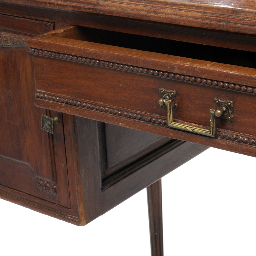 Tocador. Siglo XX. Elaborado en madera tallada. Con cubierta de vidrio biselado, cajón y 2 puertas inferiores; luna superior y espejos laterales abatibles biselados y soportes cónicos estriados. Decorado con guirnaldas y motivos florales. Presenta detalles de conservación, de estructura, fisuras, espejo roto, marcas y desgaste. Dimensiones: 179 x 100 x 50 cm. Estimado $ 4,500-6,000