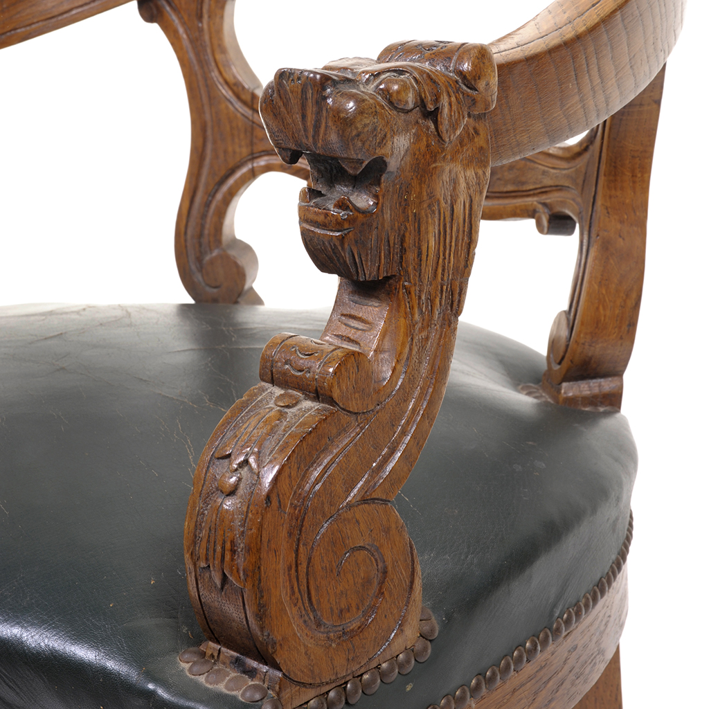 Con respaldo abierto, asiento en piel verde y soportes torzales.