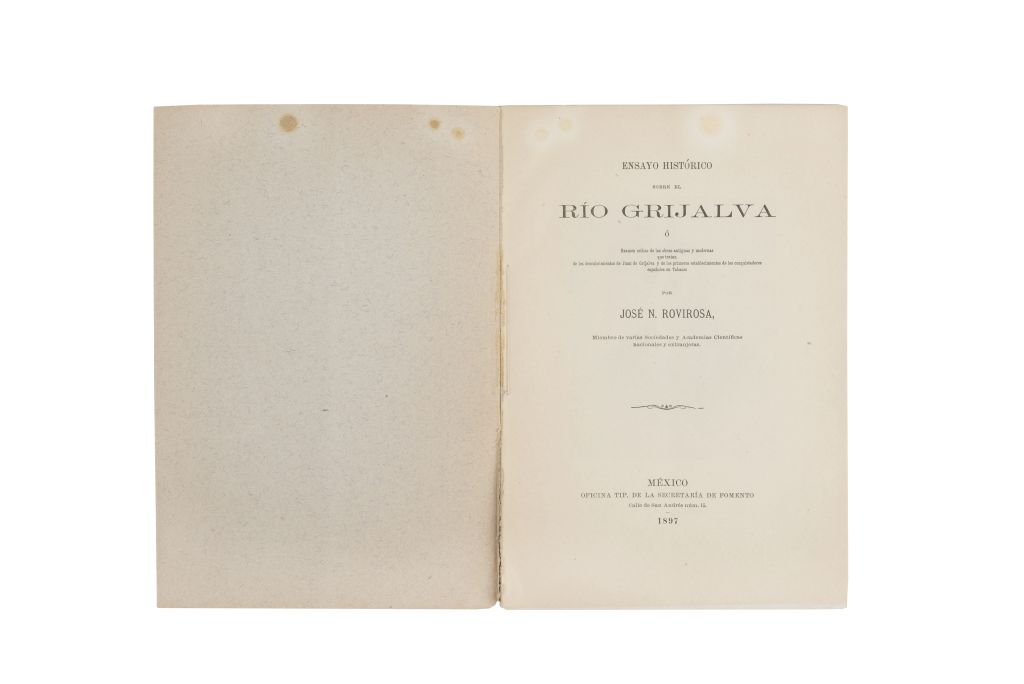 Subasta 858, Lote # 58 A - Rovirosa, José Narciso. Ensayo Histórico sobre el Río Grijalva o Examen Crítico de las Obras Antiguas y Modernas que Tratan de los Descubrimientos de Juan de Grijalva y de los Primeros Establecimientos de los Conquistadores Españoles en Tabasco. México: Oficina Tip. de la Secretaría de Fomento, 1897. 4o., 68 p. Lomo rasgado. Encuadernado en rústica. José Narciso Rovirosa Andrade fue un ingeniero, que destacó como cartógrafo, historiador, periodista, geógrafo, dibujante, botánico, meteorólogo e hidrógrafo, por lo que es considerado el científico más importante que ha dado el Estado de Tabasco. Estimado $ 2,000-3,000