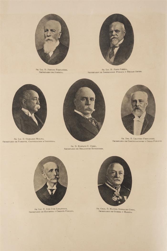 fo. marquilla, VIII + 307 + 139 (apéndice) + VII p. (índice). Retrato de Porfirio Díaz y numerosas ilustraciones (fotografías de personajes, monumentos, residencias, eventos, etc.). Pasta anterior por desprender, lomo deteriorado con faltantes. Encuadernado en pasta dura, lomo en piel.