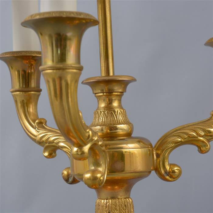 Con fuste compuesto, brazos vegetales y arandelas circulares.