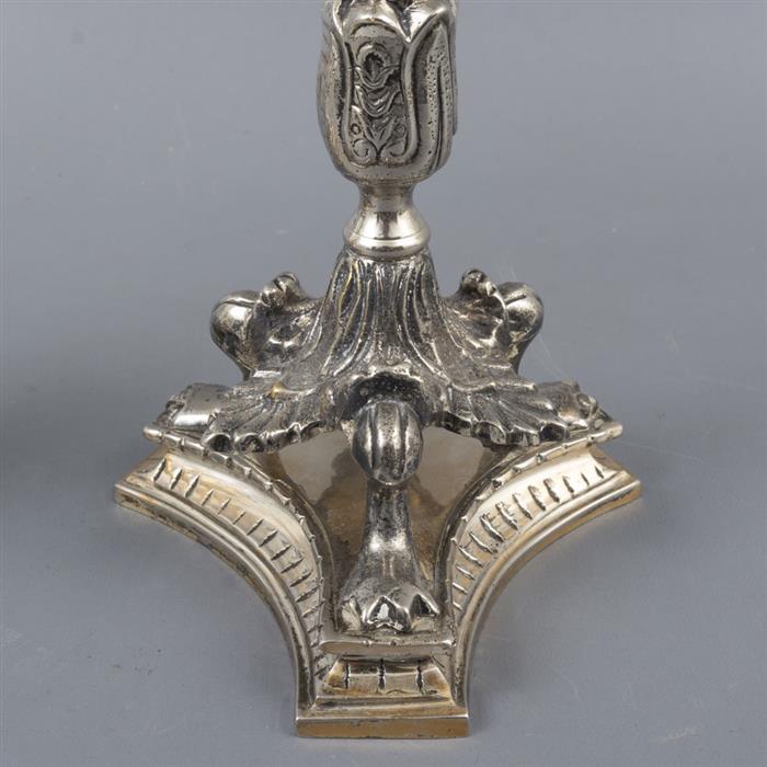 Lote mixto de 5 piezas. Siglo XX. Consta de: a) 2 candeleros. Elaborados en metal plateado. Con arandelas circulares, fustes acanalados y soportes tripodes. Decorados con elementos vegetales, zoomorfos, orgánicos y molduras. Dimensiones: 38 x 16 cm. Ø (mayor) b) 3 platones. Elaborados en cristal y uno en porcelana. Decorados con elementos orgánicos, frutales, facetados, geométricos y vegetales. Dimensiones: 8 x 29 cm. Ø (mayor) Presentan marcas, manchas y desgaste.