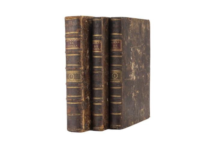 Subasta 925, Lote # 223 BB - Diaz de Montalvo, Alonso. Ordenanzas Reales de Castilla. Recopiladas, y Compuestas por el Doctor... y Glosadas por el Doctor Diego Pérez Cathedrático de Canones, en la muy Insigne Universidad de Salamanca, y Adicionada por el Mismo Autor en los Lugares que Concuerdan con las Leyes de la Nueva Recopilación. Madrid: En la Imprenta de Josef Doblado, 1779. 4o. marquilla, 8 h. + XIV + 856 p; 1 h. + 857 - 1314 p. + 8 h.; 1 h. + 577 p. Tomos I - III. Tomo III: Algunas páginas con manchas de tinta. Ex Libris de Jesús Leandro Camarena, Gobernador de Jalisco, 1876 - 1877. Pastas y lomos gastados. Encuadernados en pasta dura, en piel. Piezas: 3. Estimado $12,000-14,000
