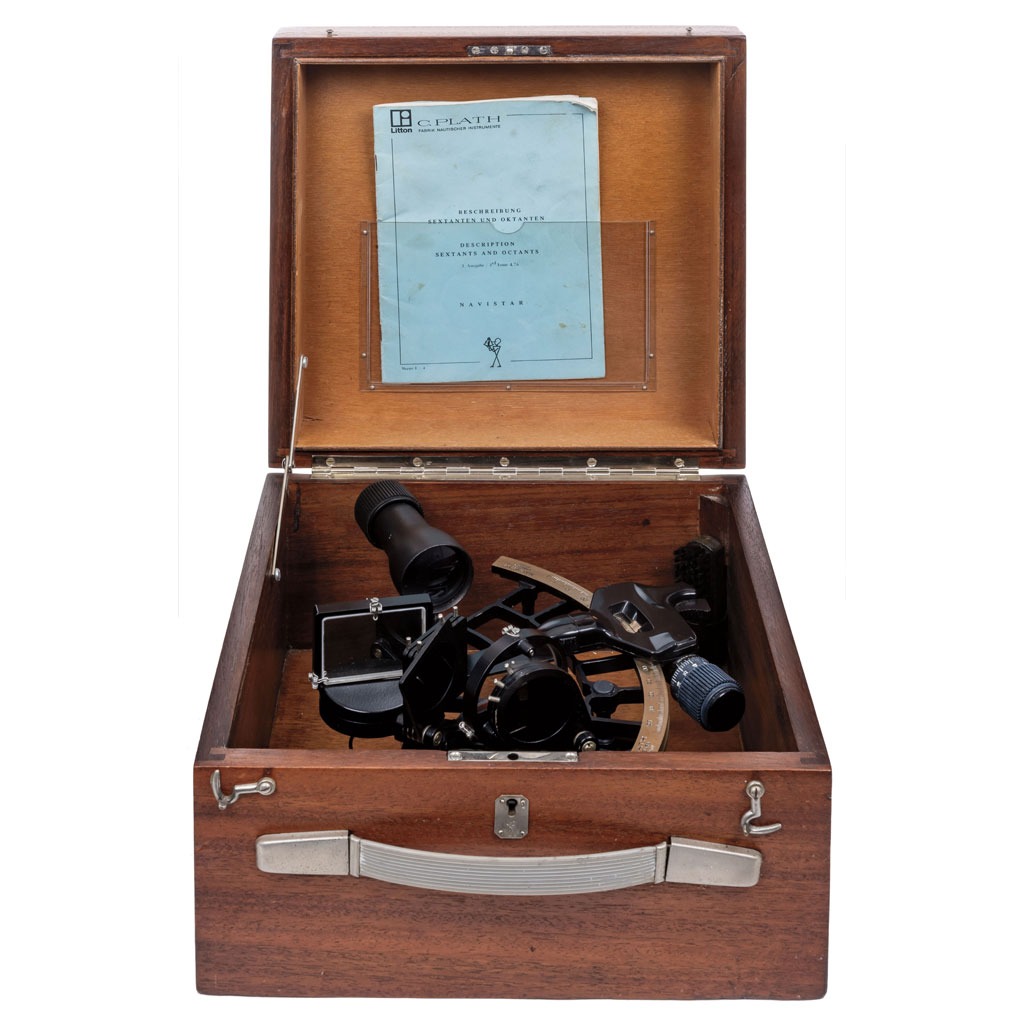 Subasta 934, Lote # 230 SEXTANTE ALEMANIA, SIGLO XX Marca CARL PLATH Elaborado en metal y bronce Cuenta con lentes, espejo y estuche de madera. Detalles de conservación 18.5 x 31 x 31 cm Estimado $15,000-25,000