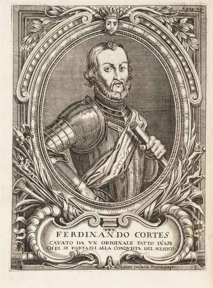 Subasta 925, Lote # 165 AC1521 - Solís, Antonio de. Istoria della Conquista del Messico. Venezia: Per Andrea Poletti, 1715. 8o. marquilla, 7 h. + 624 p. Della popolazione, e de' Progressi nell' America Settentrionale conosciuta sotto nome di Nuova Spagna. Tradotta en Toscazo de un' Académico della Crusca. Ocho láminas: Retratos de Antonio de Solís, Hernán Cortés, Moctezuma y Cinco escenas de la Conquista. Letras capitulares grabadas. Encuadernado en pergamino. Una de las ediciones más estimadas de Historia de la Conquista de México. La obra narra los acontecimientos comprendidos entre los años 1517 y 1521, desde la salida de Hernán Cortés de la Isla de Cuba hasta la reducción de la Ciudad de México y la conquista definitiva de México. El autor resalta y glorifica la persona de Hernán Cortés y ensalza las acciones de las fuerzas españolas, valiéndose de un estilo literario muy elaborado y cuidadosamente trabajado, hasta conformar una épica de la conquista del Nuevo Mundo. Estimado $12,000-15,000