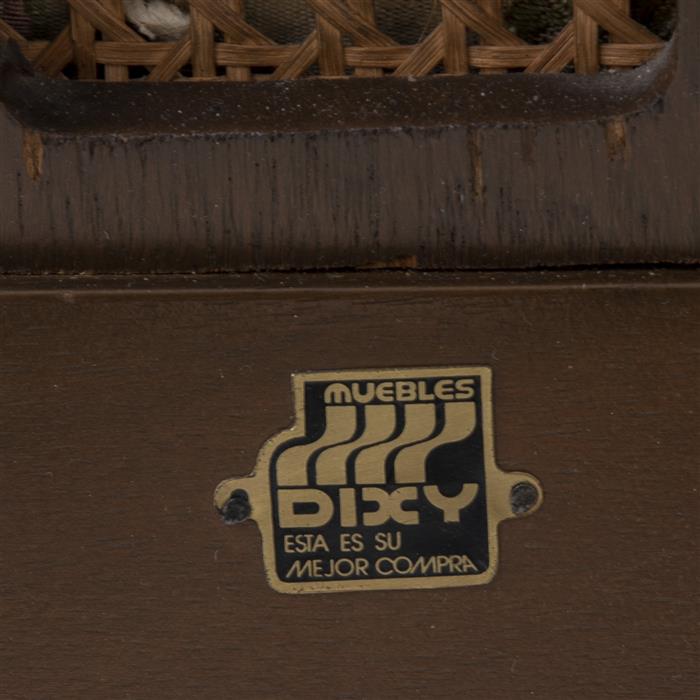 Comedor. México, siglo XX. De la marca Dixy. Consta de: a) Mesa. Elaborada en madera tallada. Cubierta circular, fuste con 4 soportes semicurvos. Decorado con motivos florales, estriados y escalonados. 73 x 142 cm de diámetro. b) Juego de 6 sillas. Respaldos semiabiertos con tejido de bejúco y asientos con tapicería floral y soportes semicurvos. Decoradas con rosetones estriados. Detalles de conservación, sillas con detalles estructurales. Piezas: 7 Estimado $3,000-4,000