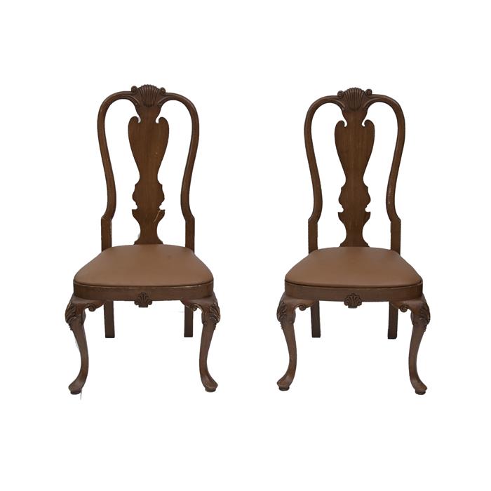 Juego de sillas. Siglo XX. Estilo Reina Ana. Estructura de madera. Respaldos semiabiertos, asientos en tapicería de vinipiel color café y soportes tipo jarrón. Detalles de conservación. Piezas: 8 Estimado $8,000-15,000