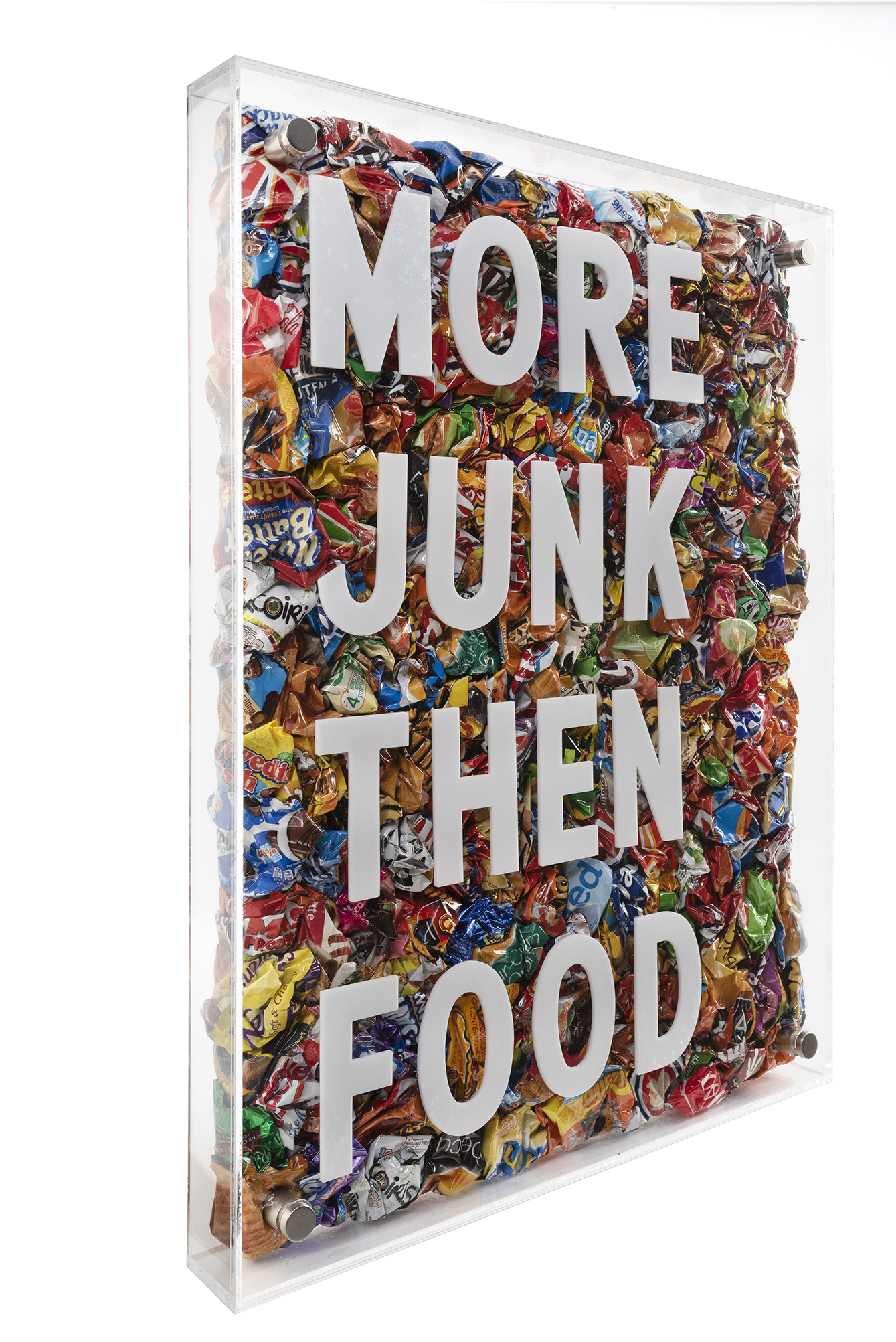Subasta 965, Lote # 211 PABLO LLANA (Tijuana, Baja California, 1980 - ) More junk then food , de la serie Open your mouth Firmada y fechada 2019 al reverso Envolturas recicladas de comida chatarra donadas por familias mexicanas y estadounidenses que consumieron estos productos, resina y hojas de acrílico sobre tela Con certificado de autenticidad del artista, 2019. Publicada en: sitio oficial del artista www.pablollana.com. Exhibida en: "Eye Candy", muestra individual presentada en la galería Artículo 123 en la Ciudad de México, junio del 2019. Realizó estudios en el Taller Casa de la Cultura de Tijuana y en el Programa Educativo de Profesionalización Artística PROPAVIS, impartido en el Centro de Humanidades de Baja California donde fue alumno de Felipe Ehrenberg. Entre sus exposiciones individuales se encuentra "Yo Código Comunidad" en el Centro Cultural Tijuana CECUT, "Speechless" en La Caja Galería en Tijuana y "Mouthful" en el Instituto de Artes Gráficas de Oaxaca IAGO. También ha participado más de 50 exposiciones colectivas en ciudades como Los Ángeles, San Diego, Frankfurt y La Habana. Gran parte de su trabajo se ha enfocado en investigar el consumo masivo de comida chatarra por parte de las clases sociales vulnerables. Así recupera de comunidades las envolturas de distintos productos comerciales para encapsularlos en cajas de acrílico. Cada pieza contiene una frase que reconfigura el consumo desde una posición crítica en relación al sistema neoliberal. En palabras del artista "somos víctimas de la sociedad de un consumismo desmedido". Fuentes consultadas: sitio oficial del artista www.pablollana.com y en sitio oficial de Artículo 123 www.artículo123.com 64 x 49.5 cm USD $1,100-$1,500 Estimado $22,000-30,000