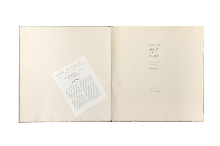 fo. doble marquilla, 3 h. (texto) + Tres xilografías. Primera edición. Poema de Octavio Paz en español, francés e inglés. Grabados xilográficos especialmente comisionados al artista polaco-francés Balthus (Balthasar Klossowski de Rola), impresos en papel japonés "Kozo Uwazen" hecho a mano. Comentario de la editorial Limited Editions Club sobre la obra. Edición de 300 ejemplares numerados, ejemplar número 161. Firmado por Balthus y por Octavio Paz. Encuadernado en pasta dura, en tela. En estuche.