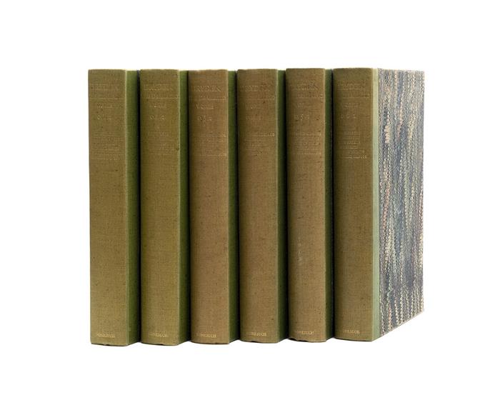CB - Dryden: The Dramatic Works. London: The Nonesuch Press, 1931 - 1932. 4o. marquilla, 459 p. + 3 h.; 532; 595; 601; 545; 594 p. Tomos I - VI. Edición de 750 ejemplares numerados, ejemplar número 405. Encuadernados en pasta dura. Piezas: 6.