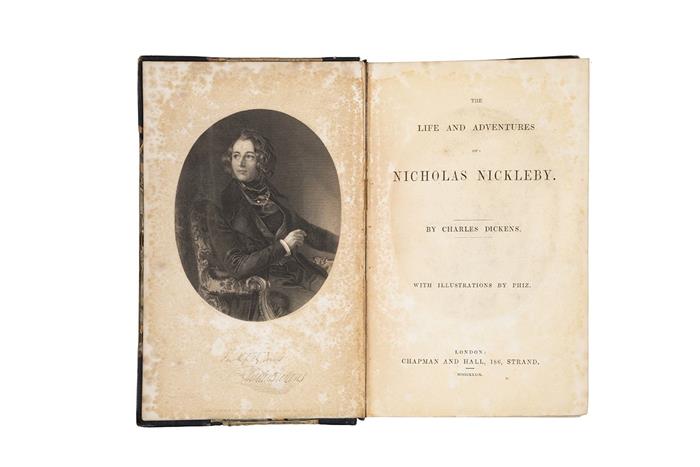 Subasta 936, Lote # 166 CB - Dickens, Charles. The Life and Adventures of Nicholas Nickleby. London: Chapman and Hall, 1839. 8o. marquilla, 624 p. Primera edición, estado mixto. Ilustraciones de Phiz. Fronstispicio, retrato del autor por Finden. Con dos errores tipográficos: página 123, línea 17 "sister" en lugar de "visiter" y en página 160, sexta línea de abajo a arriba, "latter" en lugar de "letter". Láminas de la página 18 a la 45, son primer estado, con sello de la editorial Chapman and Hall. Con Ex Libris de William Frederick Farrer. Algunas páginas desprendidas. Encuadernado en pasta dura, lomo y puntas en piel. Provenance: Subasta Christie's 1998. Estimado $16,000-20,000