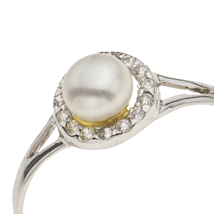 Anillo con perla y simulantes en oro blanco de 14k de la firma Bizzarro.