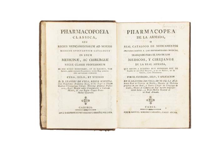 AC1759 - Vega, Leandro de. Pharmacopea de la Armada o Real Catálogo de Medicamentos Pertenecientes a Enfermedades Médicas, Trabajado para el Uso de los Médicos, y Cirujanos de la Real Armada. Cádiz: Manuel Ximenez Carreño, 1759.