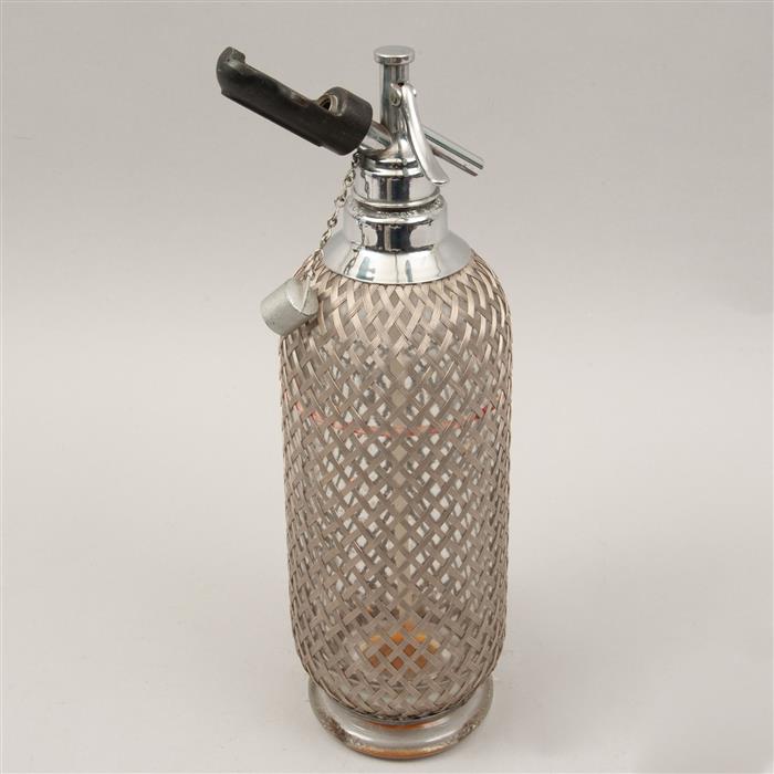 Botella de vidrio con funda de rejilla y tapón de metal cromado Sparklets Makers.
