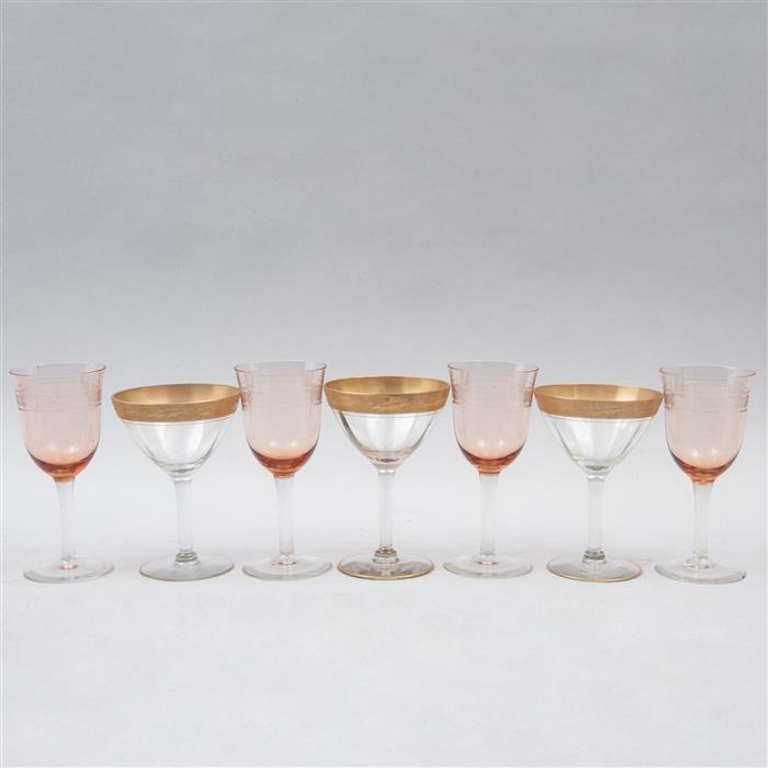 Servicio abierto de copas. Siglo XX. Elaboradas en cristal, con cenefas orgánicas, una en esmalte dorada. Diseños lisos. Detalles de conservación, despotillados. Piezas: 12 Estimado $1,500-2,500