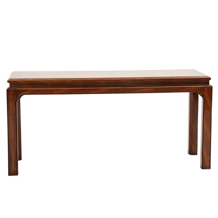 Mesa consola. Elaborada en madera de caoba Alfonso Marina. Con cubierta rectangular con enchapado de raíz de olmo y soportes lisos. Decorada con acanalados y escalonados. Detalles de conservación. 71 x 150 x 50 cm Estimado $5,500-10,000