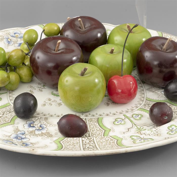 Lote de platones y frutas decorativas.