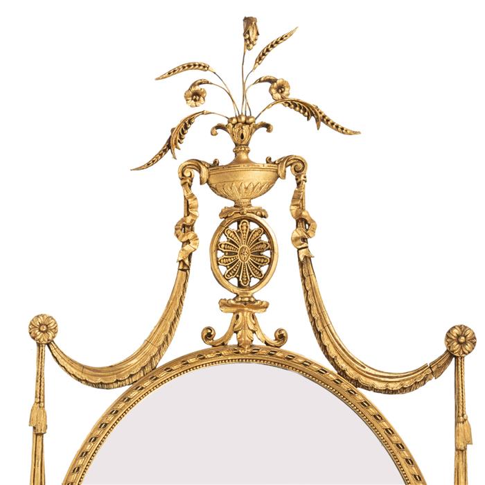 Espejo. Mediados del siglo XX. Estilo Imperio. Diseño oval. Estructura de madera con estuco en esmalte dorado. Decorado con lacería, cortinajes, rosetones y remate de copa. Detalles de conservación, estructura, fisuras. 139 x 66 cm Estimado $18,000-22,000