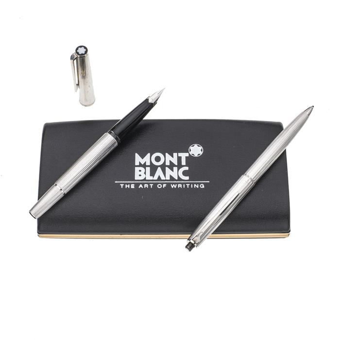 Subasta 1029T, Lote # 111 Pluma fuente y lapicero MontBlanc. Cuerpo en plata .925. Punto en oro blanco de 18k. Estuche original. Estimado $7,000-9,000