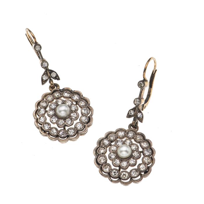 Subasta 1029T, Lote # 194 Par de aretes con diamantes y perlas en oro amarillo de 10k. 2 perla cultivadas color crema de 3 mm. 54 diamantes corte 8 x 8. Peso: 7.5 g. Estimado $6,500-9,000