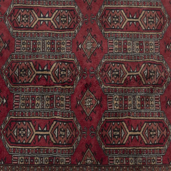 Decorada con elementos geométricos en colores rojo, marrón, beige, anaranjado y negro sobre fondo rojo.